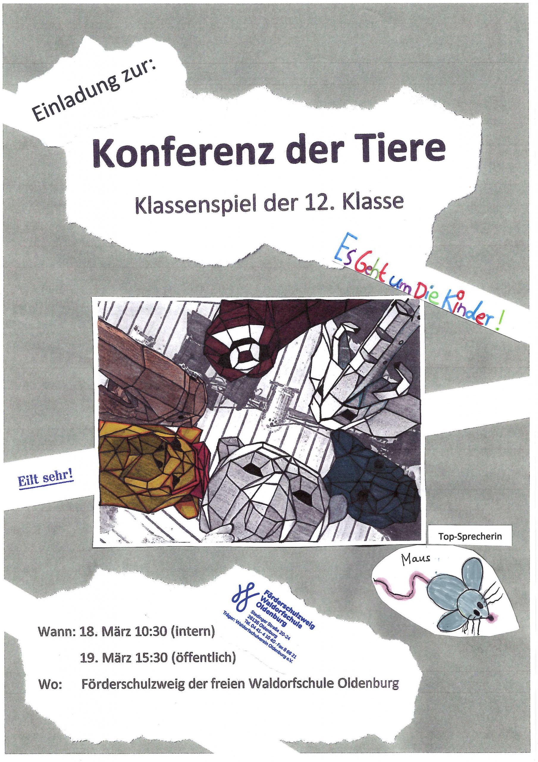 KARNEVAL DER TIERE Wir laden Sie herzliche zum Klassenspiel der 12. Klasse in den Förderschulzweig der Freien Waldorfschule Oldenburg ein. Wann: 19.März 2026 um 15:30 Uhr Wir freuen uns auf Ihr kommen.